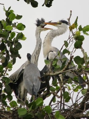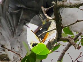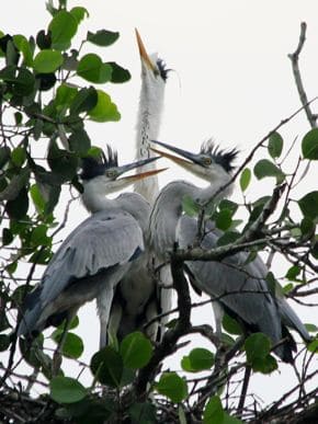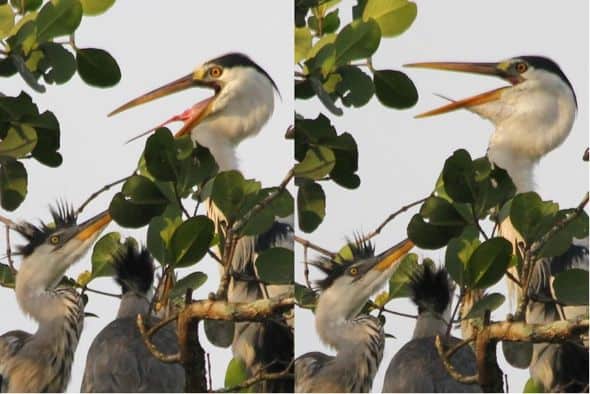 “The chicks were quite sensitive to the presence of adult herons. When the chicks sensed the return of their parents, their crests will be raised in excitement and they will typically start their begging calls that sounded like bills clapping. After landing in the nest, the feeding ritual begins with the adult heron pointing its bill to the sky. Its crest will be raised and its bill closed. The food is nowhere to be seen as it has been swallowed and stored in the crop. The chicks will raise their heads to look at the adult, waiting in anticipation (above left).