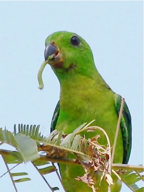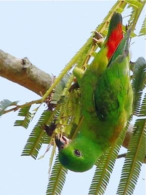 “What do parrots eat? According to Wikipedia, the most important components of most parrots’ diets are seeds, nuts, fruits, buds and other plant material. A few species sometimes eat animals and carrion. The only animal food found in previous BESG postings for parrots was that of a bagworm ‘cocoon’ that the Red-Breasted Parakeets (Psittacula alexandri) were feasting on LINK. Now, we can add another record: the first animal food for the Blue-Crowned Hanging-parrot (Loriculus galgulus).